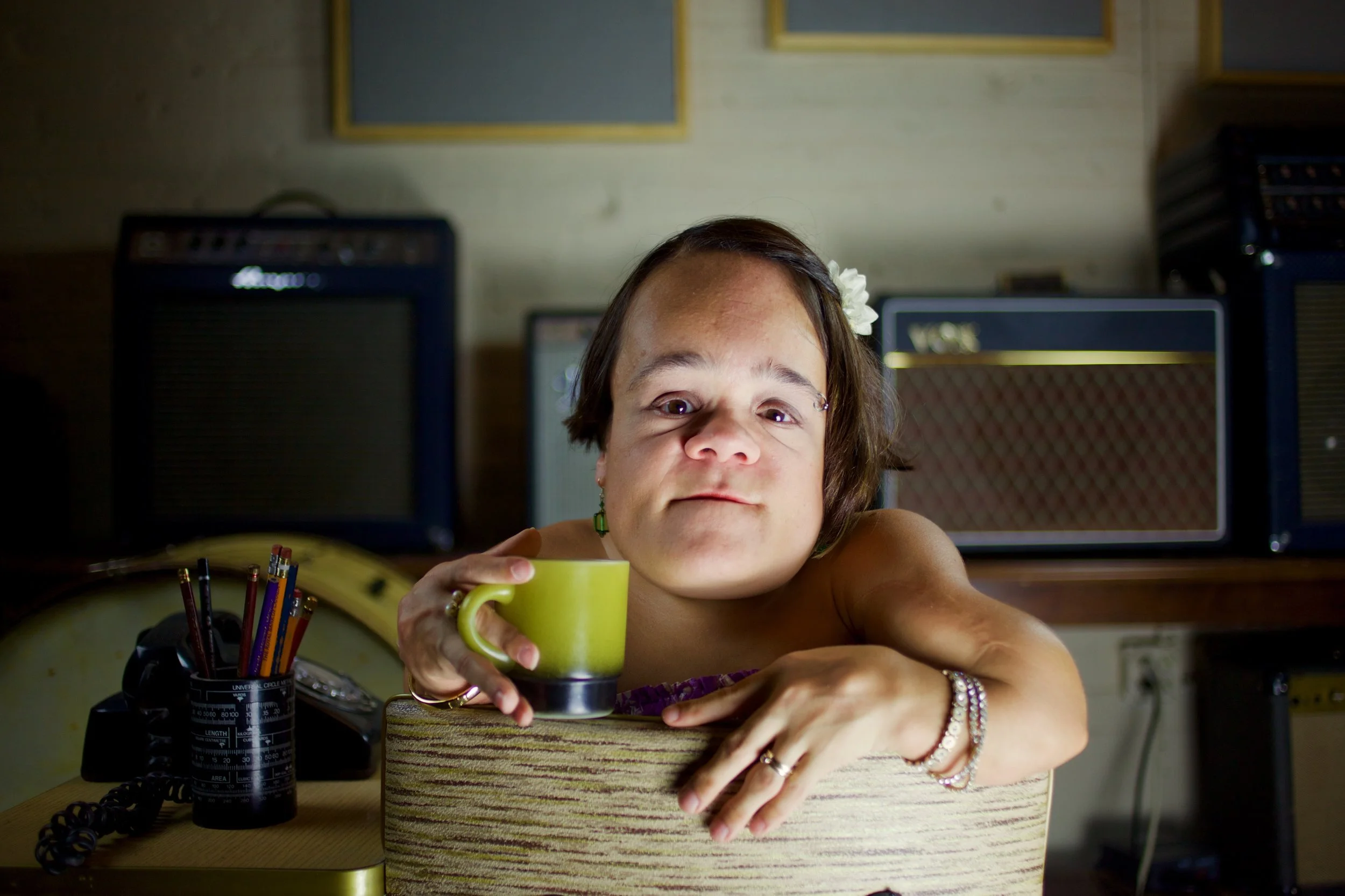A woman with short brown hair, a white flower, and jewelry holds a green mug while leaning on a chair, with amplifiers and musical equipment in the background.