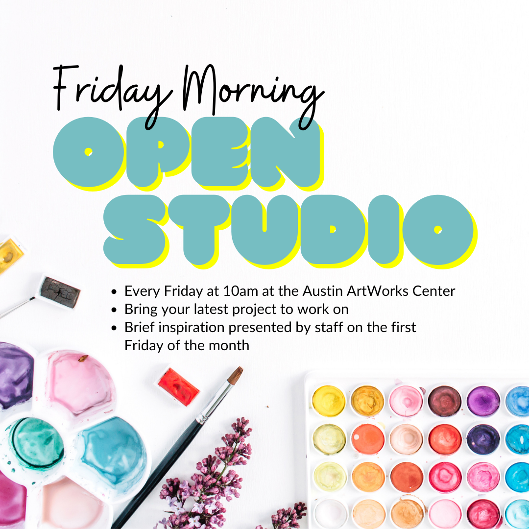 Open Studio Friday, July 15, 2022 10:00 AM 12:00 PM Austin ArtWorks Center 300 N. Main St. Austin, MN 55912 (map) Google Calendar ICS