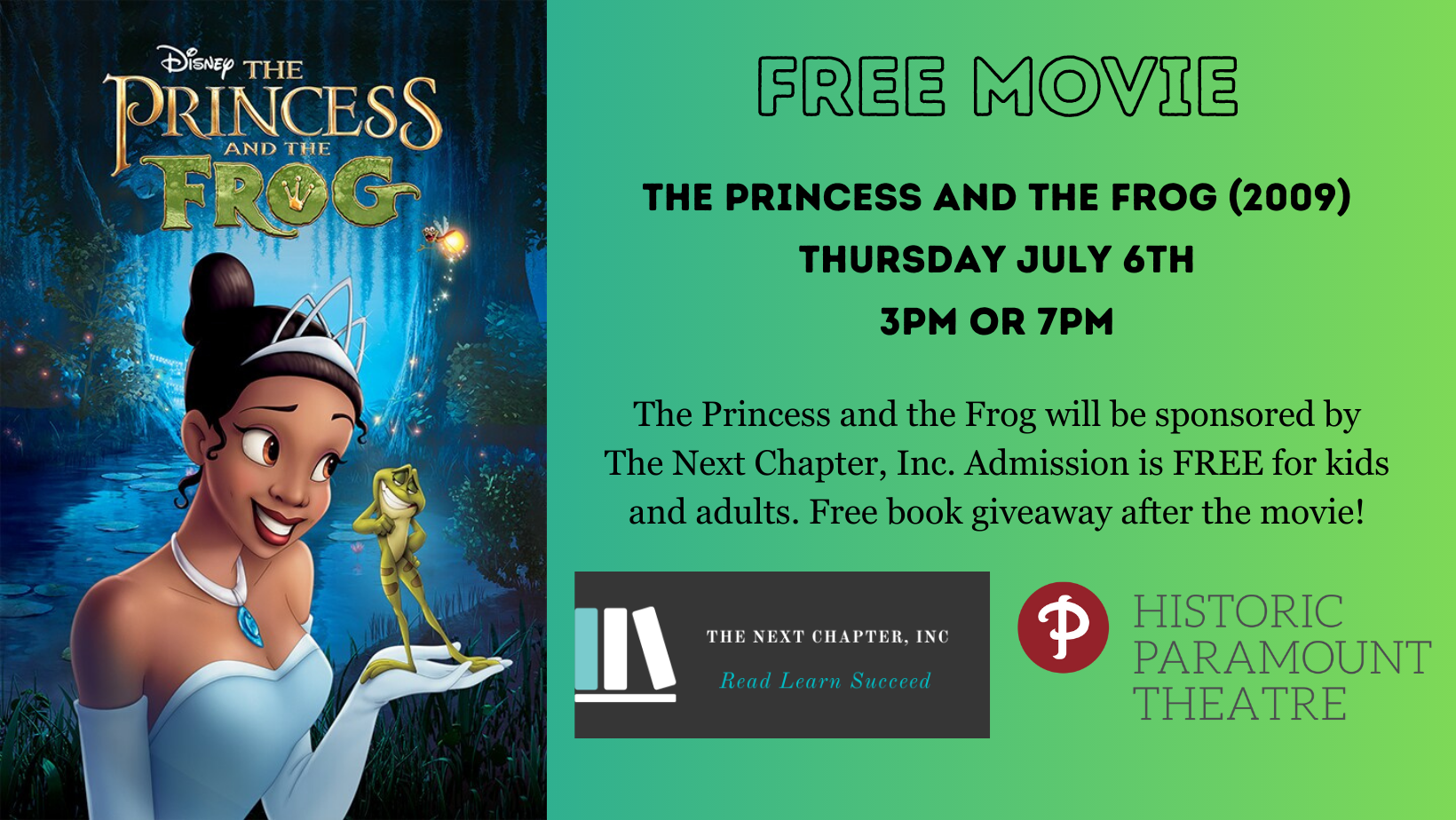 The Princess and the Frog is presented in partnership with The Next Chapter, Inc. Admission is FREE for kids and adults. Free book giveaway after the movie!