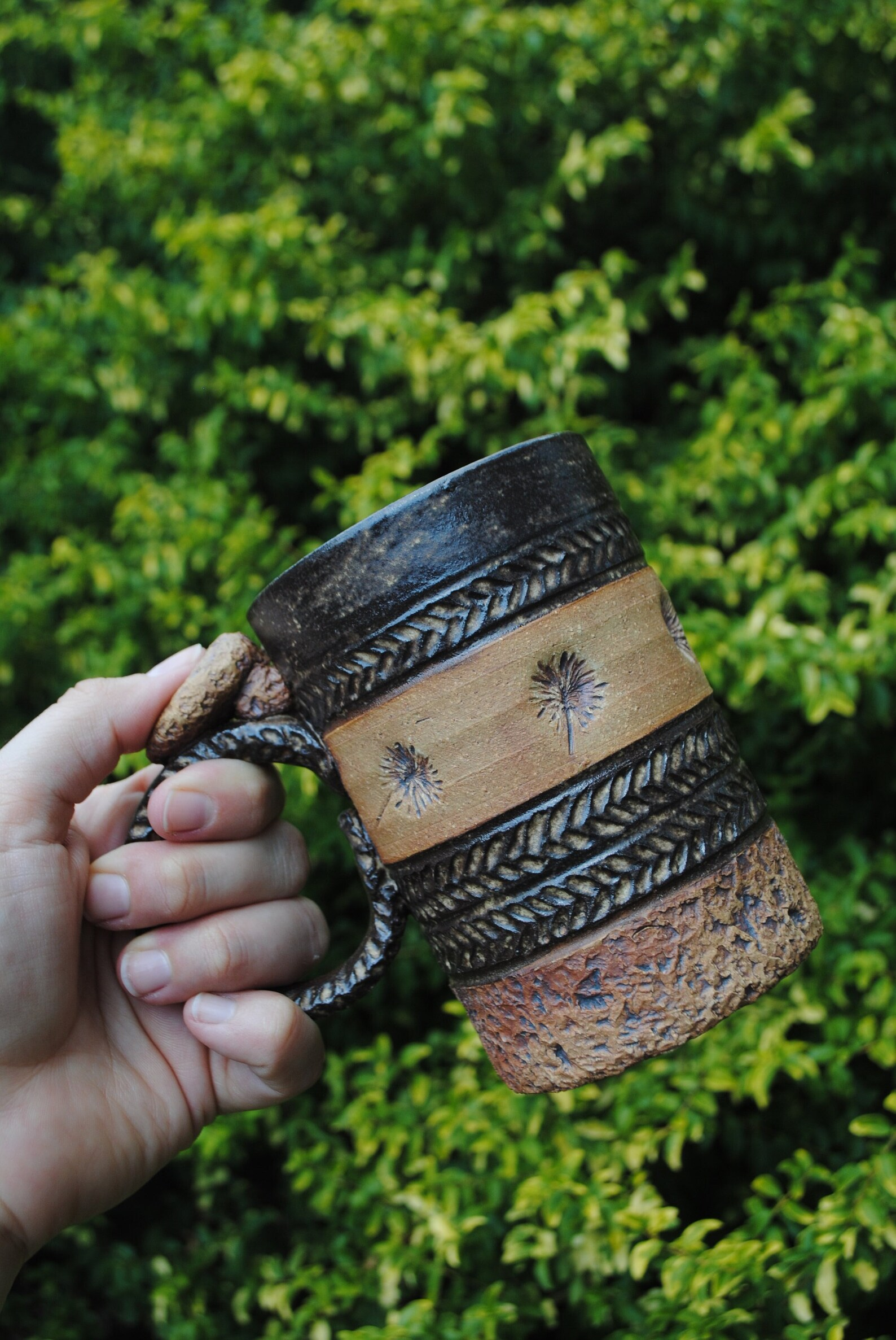 A hand holding a rustic, handcrafted ceramic mug with intricate patterns and earthy tones, against a green foliage background.